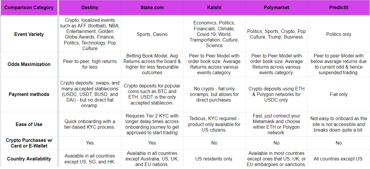 When compared to other prediction market platforms, Destiny scores fairly high marks in terms of available event types, fees, payment methods, and ease of use.