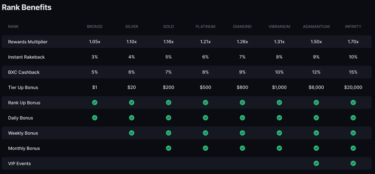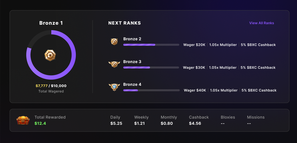 Your rank depends on how much you wager. Each level brings a higher rewards multiplier, meaning a bigger bonus rewards for you! So bet more, earn more!