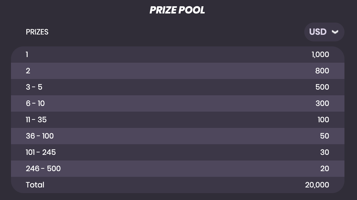 - Top 500 players with the highest scores on the weekly leaderboard will win prizes worth a total of $20,000.