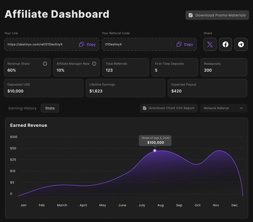 - Exclusive Promotion: We ask that our VIP affiliates promote DestinyX exclusively. We believe in investing in those who share our passion for seeing DestinyX thrive.
